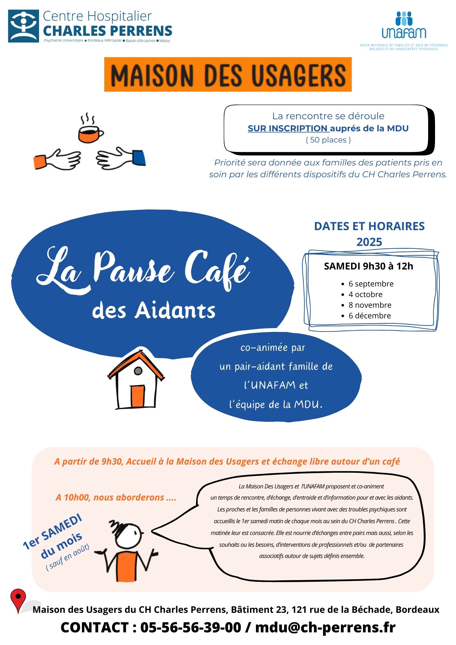 Dans le cadre du soutien aux aidants, la Maison Des Usagers a le plaisir de vous informer du lancement d’un temps de rencontre, d’échange, d’entraide et d’information co-animé avec l’UNAFAM :