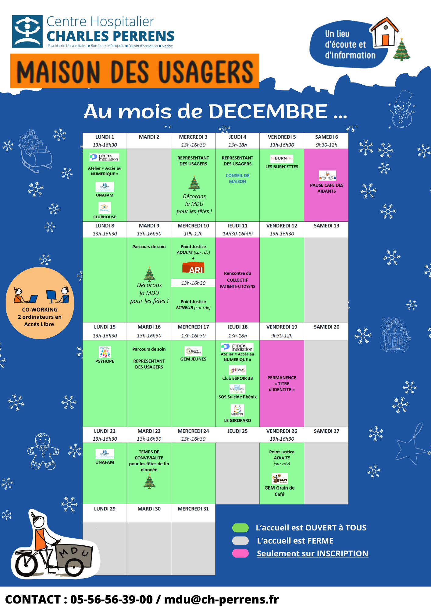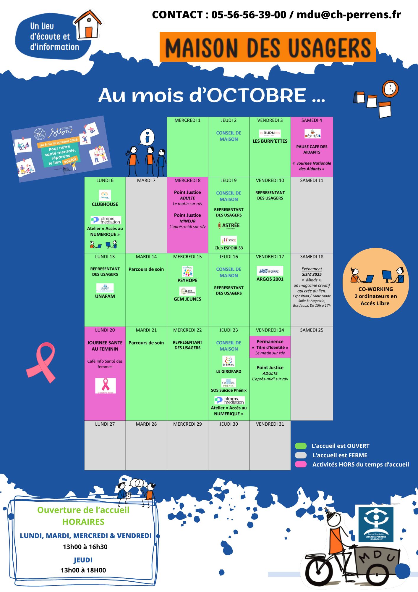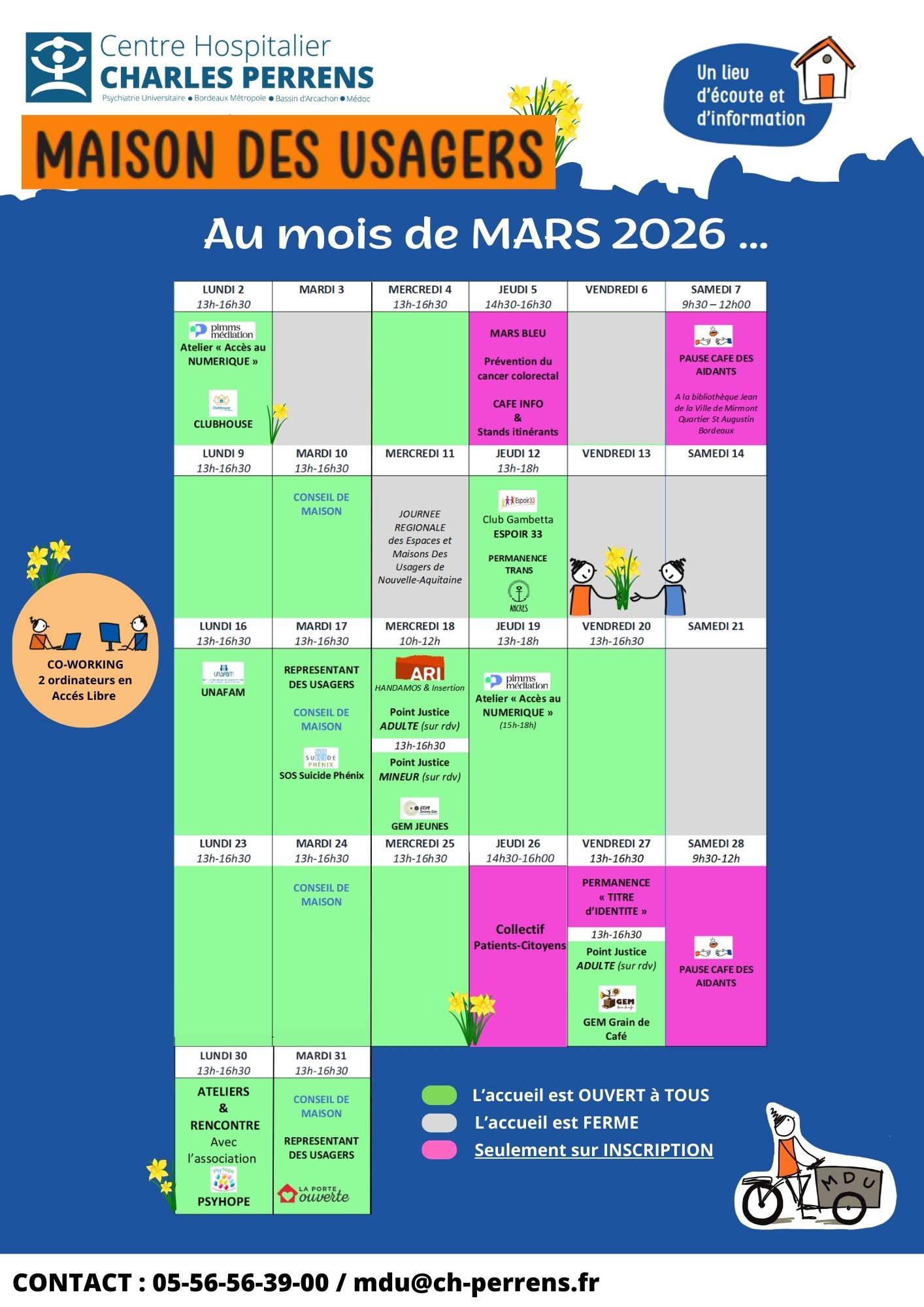 L'animatrice de la Maison des Usagers, joignable par téléphone (05.56.56.39.00) ou par courriel (mdu@ch-perrens.fr), est disponible pour toute information.