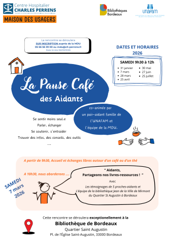 Dans le cadre du soutien aux aidants, les proches et la famille de personnes vivant avec des troubles psychiques sont accueillis un samedi par mois de 9h30 à 12h, au sein du CH Charles Perrens par l'équipe de la Maison Des Usagers et un pair-aidant famille de l'UNAFAM.