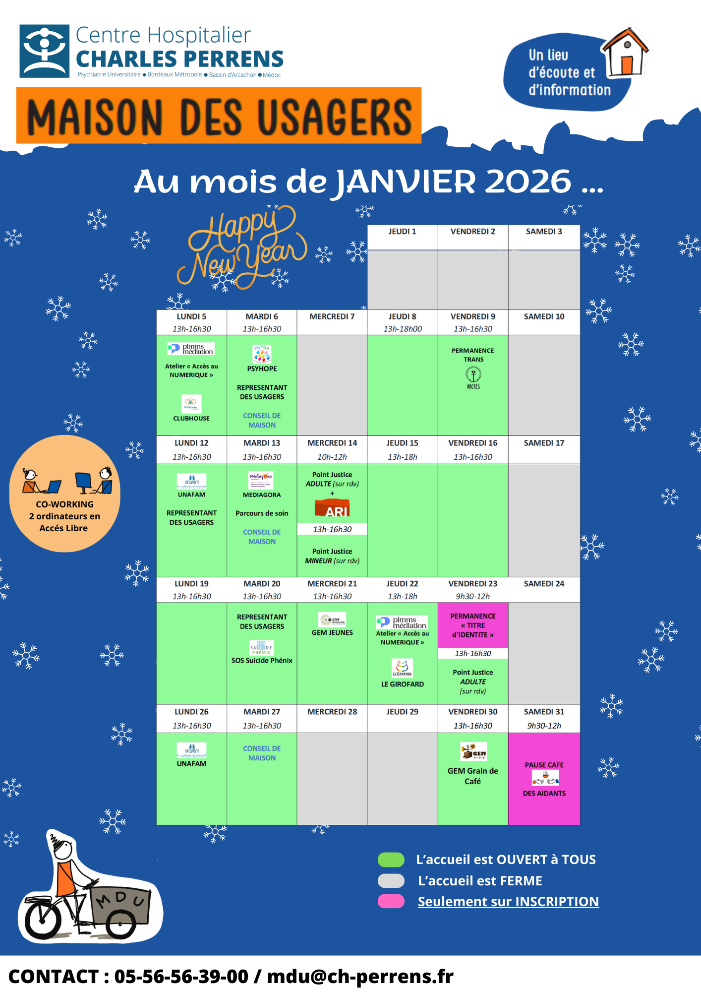 L'animatrice de la Maison des Usagers, joignable par téléphone (05.56.56.39.00) ou par courriel (mdu@ch-perrens.fr), est disponible pour toute information.