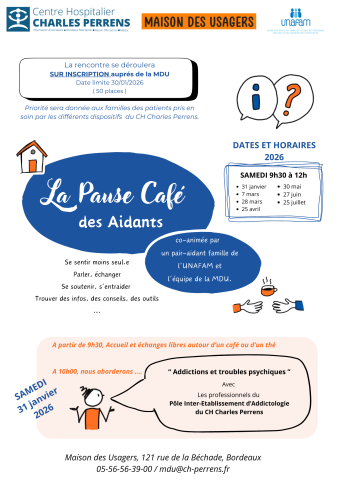 Dans le cadre du soutien aux aidants, les proches et la famille de personnes vivant avec des troubles psychiques sont accueillis un samedi par mois de 9h30 à 12h, au sein du CH Charles Perrens par l'équipe de la Maison Des Usagers et un pair-aidant famille de l'UNAFAM.